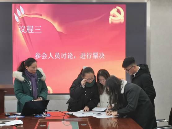 教师党员林丽监票,学生党支部工作人员统计此次党员大会投票票数