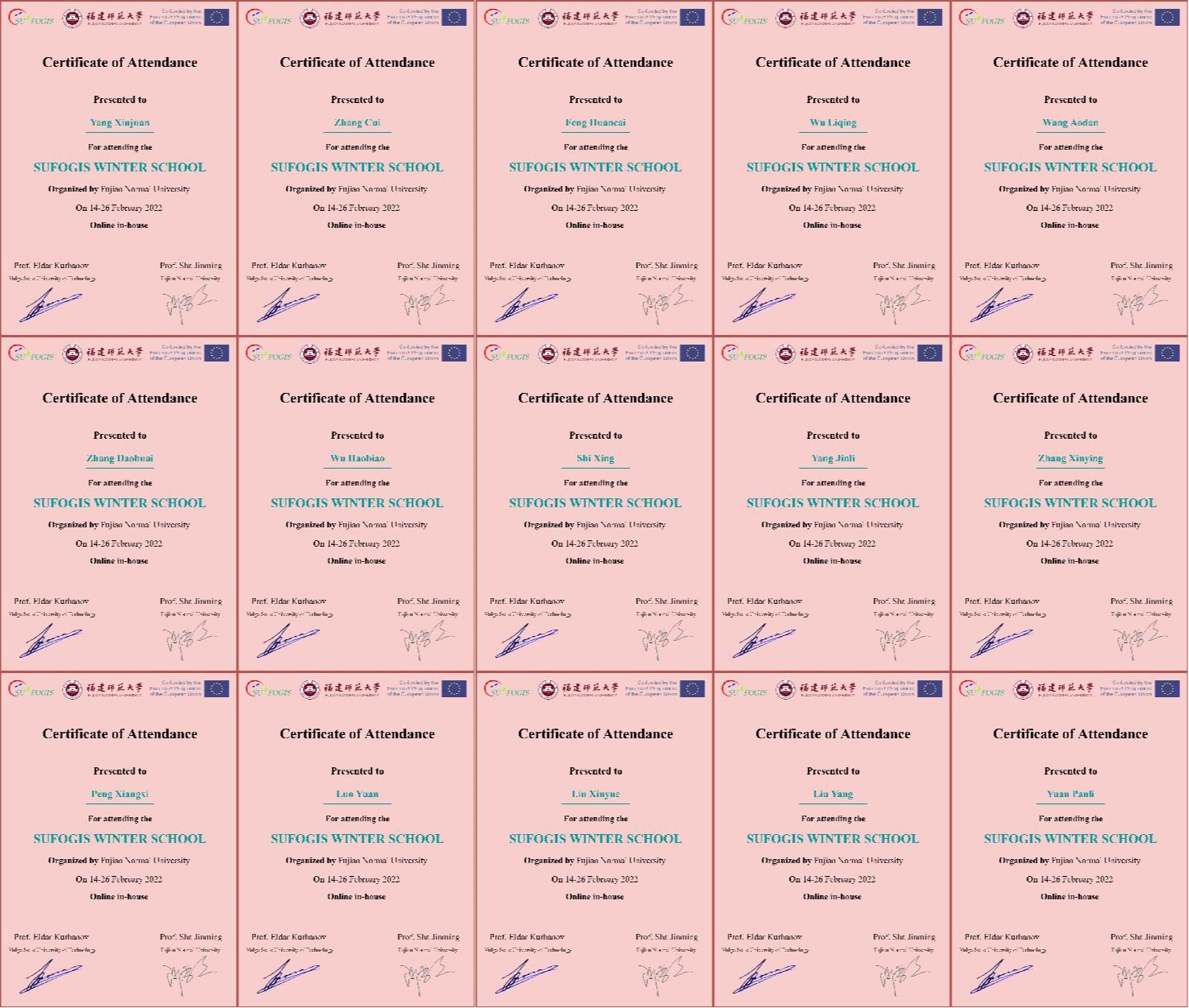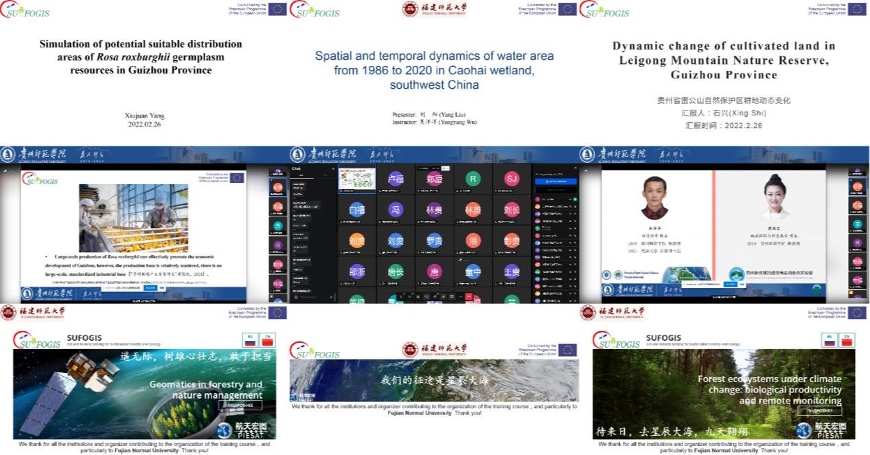 为了提高国际交流合作水平,2022年2月14-日26日(北京时间),贵州山地研究院罗光杰教授、贵州省流域地理国情监测重点实验室吴洋洋、樊瑞雪副教授等带领金沙集团1862cc20余名同学参加了由福建师范大学承办的欧盟合作项目GIS And Remote Sensing For Sustainable Forestry And Ecology(SUFOGIS)冬季学校,限于疫情防控需要,本次冬季培训采用线上会议方式开展。参加此次会议的有中国、俄罗斯、欧盟等国内外专家学者与高校学生。本次活动得到欧盟ERAMUS+ SUFOGIS项目(598838-EPP-1-2018-EL-EPPKA2-CBHE-JP)的资助。